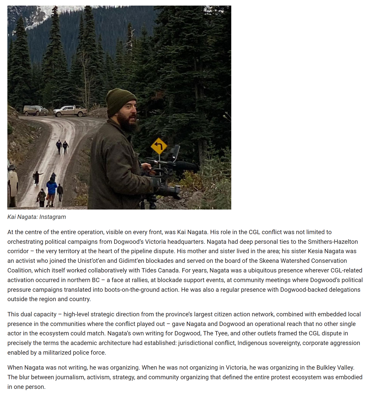 This dual capacity – high-level strategic direction from the province’s largest citizen action network, combined with embedded local presence in the communities where the conflict played out – gave Nagata and Dogwood an operational reach that no other single actor in the ecosystem could match. Nagata’s own writing for Dogwood, The Tyee, and other outlets framed the CGL dispute in precisely the terms the academic architecture had established: jurisdictional conflict, Indigenous sovereignty, corporate aggression enabled by a militarized police force.