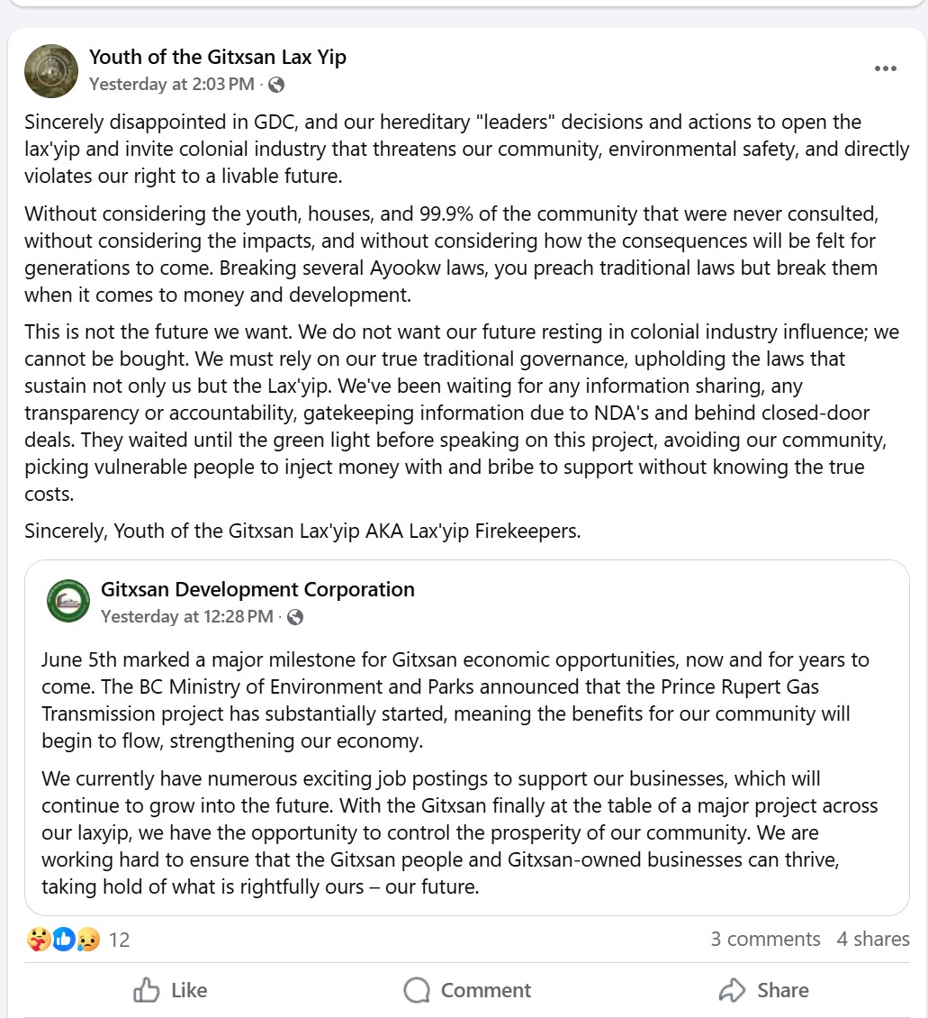 They start by making the erroneous claim that “Our elders and leaders called on us to host a meeting to discuss the pipeline impacts” No this was hatched by the SWCC and the same people who tried to block the CGL Pipeline, all the same names appear again. They do not represent the Gitxsan Nation but represent a very aggressive funded opposition.