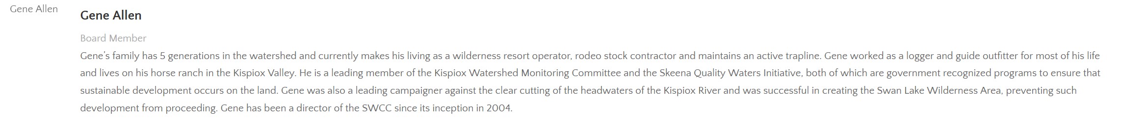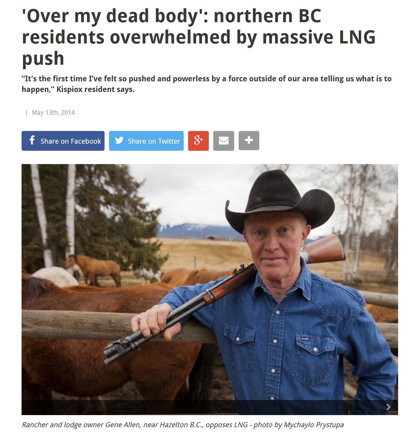 Quote ” “Ms. McPhail’s father, Gene Allen, is a former logger whose family owns the Bear Claw Eco-Lodge on the Kispiox River, just a stone’s throw from the drilling. The lodge hosts guests from around the world and employs dozens of locals in what Mr. Allen calls “sustainable jobs” based on the bounty of local rivers.”
