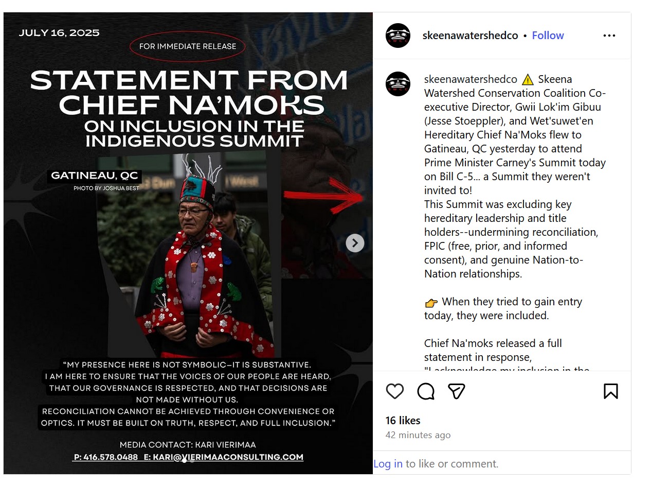 Skeena Watershed Conservation Coalition Co-executive Director, Gwii Lok’im Gibuu (Jesse Stoeppler), and Wet’suwet’en Hereditary Chief Na’Moks flew to Gatineau, QC yesterday to attend Prime Minister Carney’s Summit today on Bill C-5… a Summit they weren’t invited to!