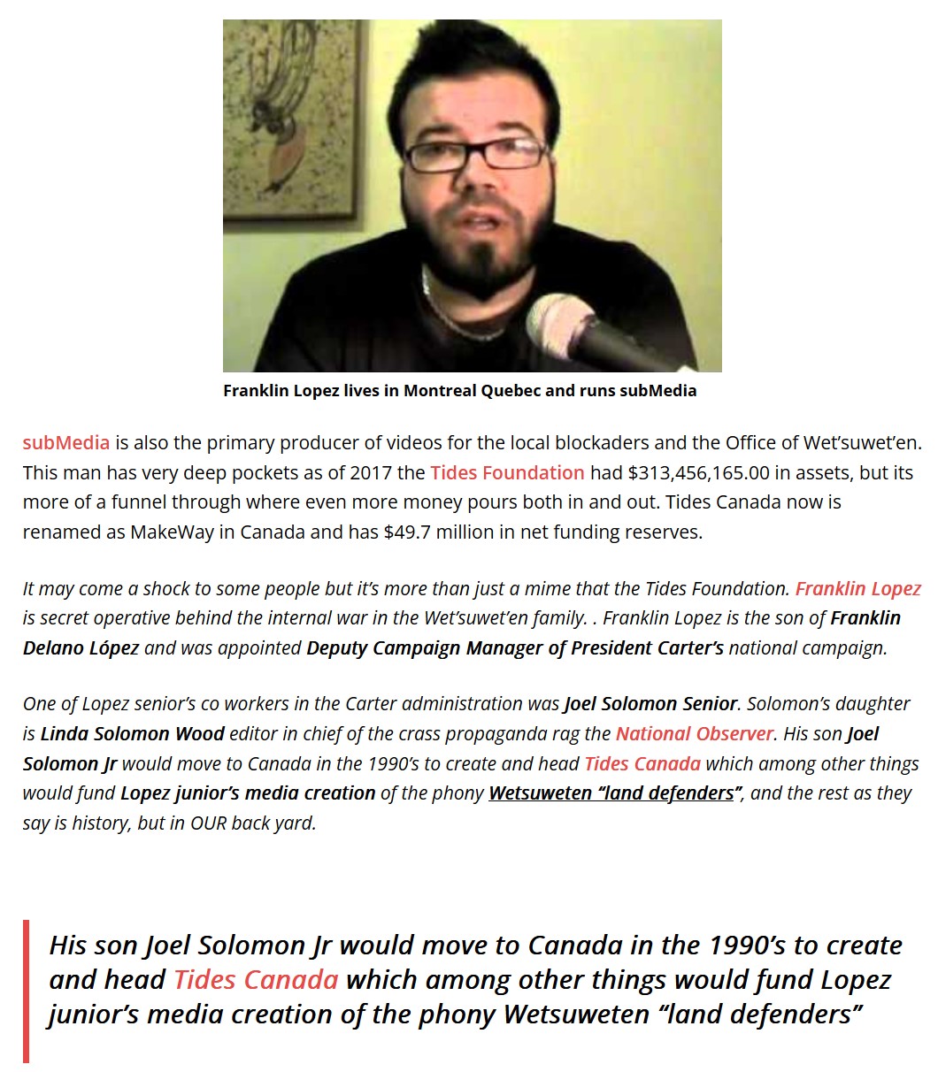 “Land defenders” is a term created by Franklin Lopez who lives in Montreal Quebec and runs subMedia So in a nutshell it all comes back to The American Tides Foundation, aka the MakeWay Foundation.  Read more at these links. The people behind the CGL Blockades and Franklin Lopez – Blockader Profile. The term land defenders is a false narrative for activists who mostly employed by rich American’s who want to destroy Canada in order to take over all of Canada’s assets. Aboriginals are just a ways and means to accomplish this goal.  They are destroying the foundation of Canada, and robbing our children of a good paying future by turning Canada into a third world nation. These extremists are costing BC Taxpayers millions of dollars that could have funded our social programs. These people are hurting all of us.