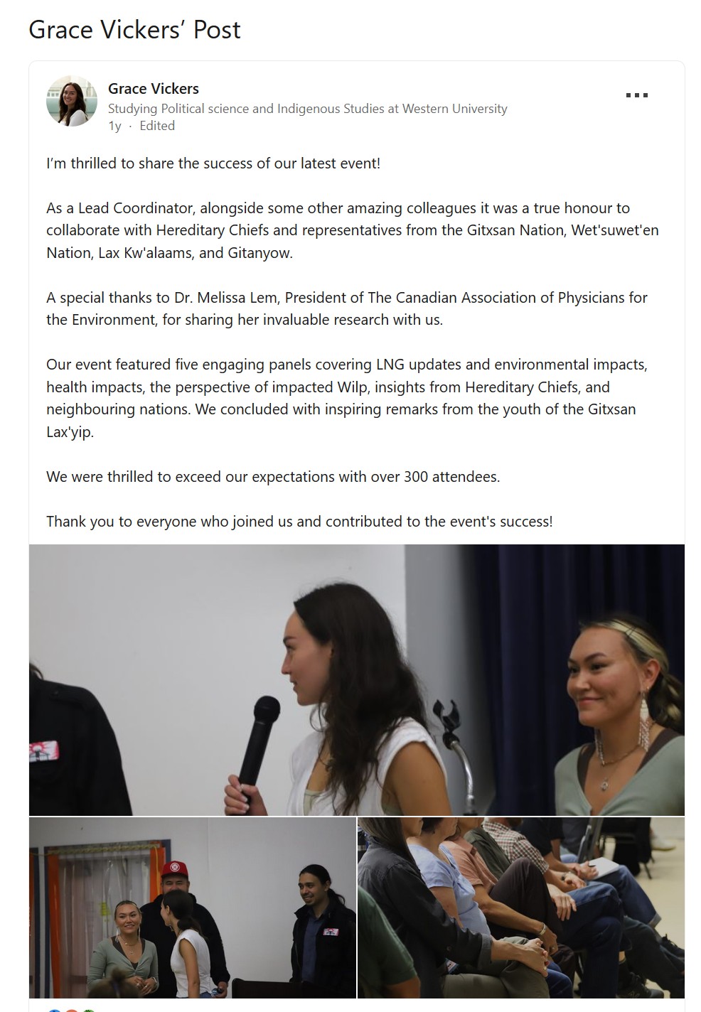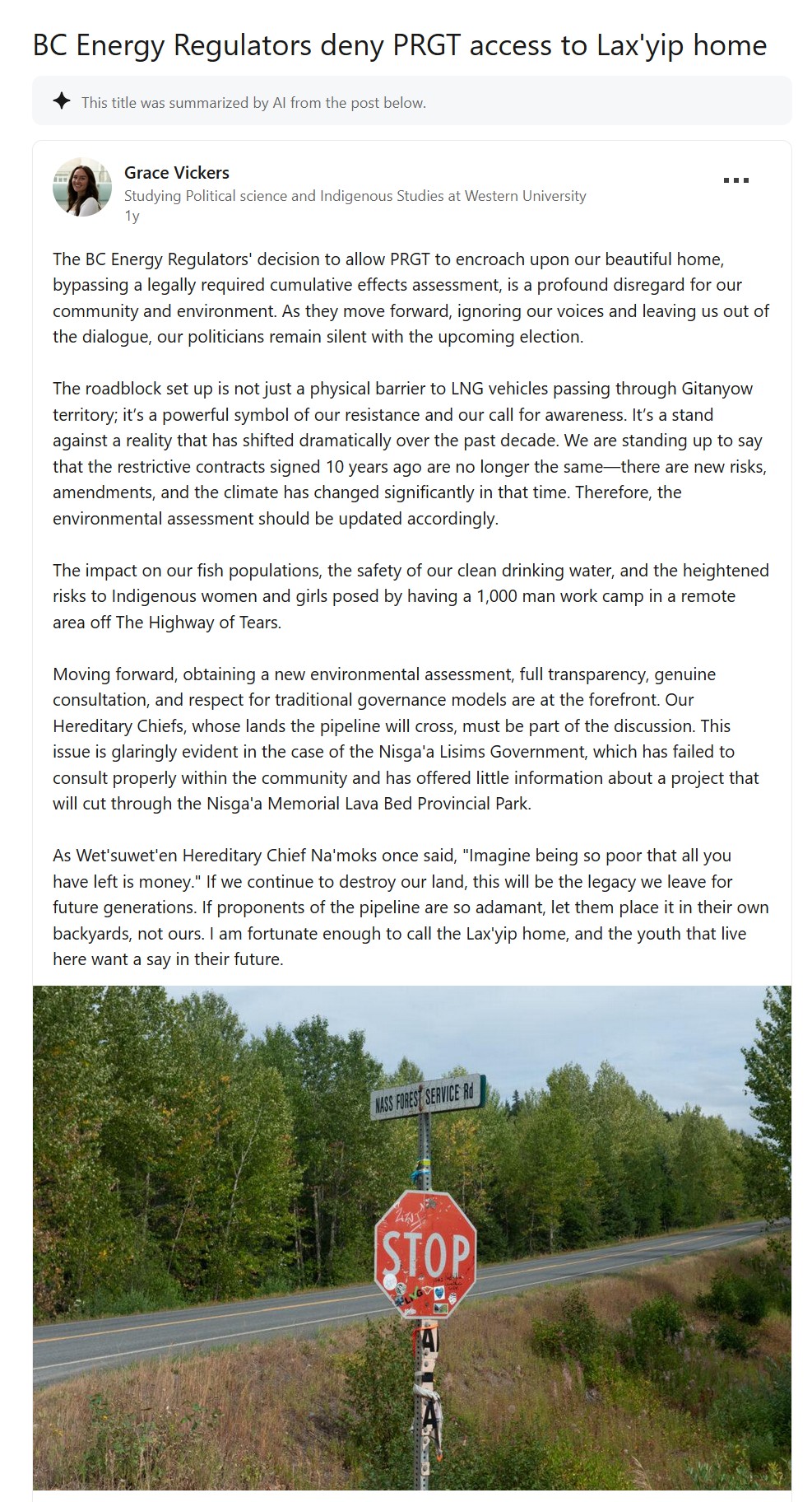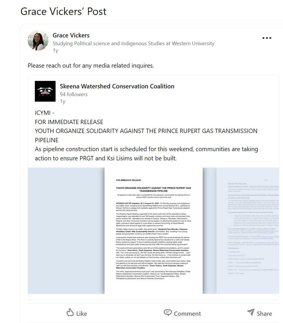 Walking in the footsteps of her father who retired from the Skeena Watershed Conservation Coalition Grace has taken over and working her way up inside this organization. She is also a so called member of the Lax’yip Firekeepers another media label created in the boardrooms of the Skeena Watershed Conservation Coalition working hand in hand with a small group that have taken over the Kispiox Band Council. Grace Vickers is a member of the Gitxsan First Nations.