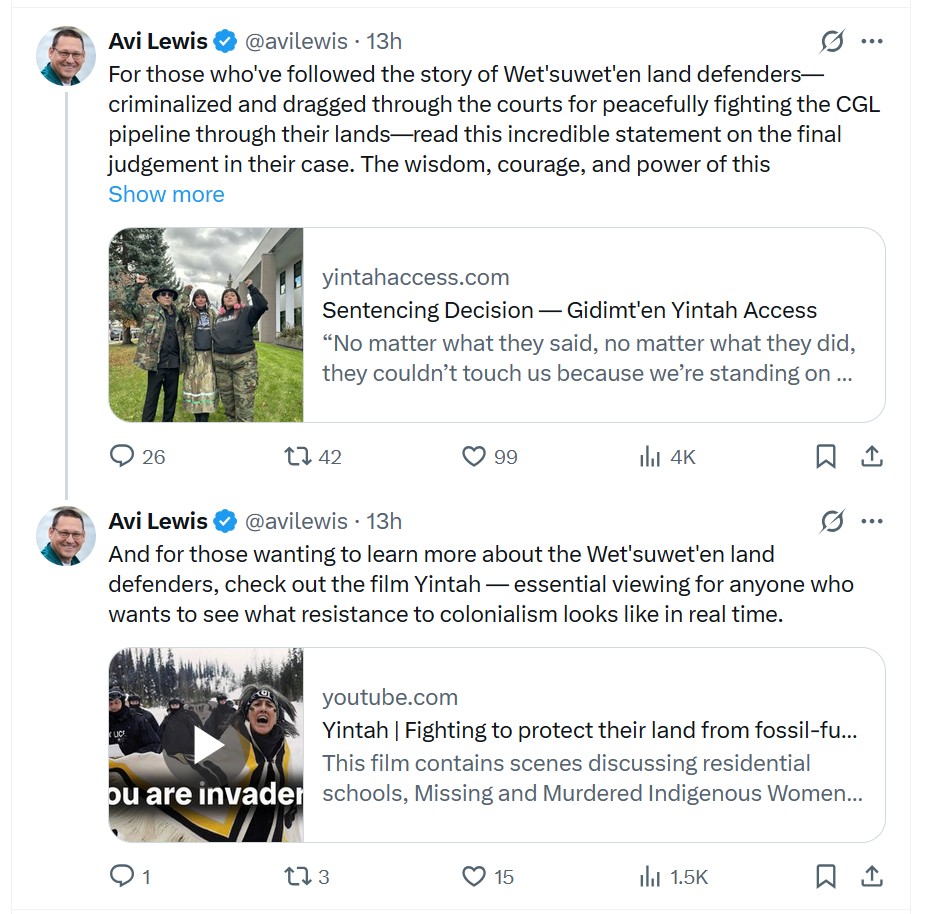 Once again we find individual using aboriginals as a ways and means to get elected, what is most galling is that they never stand behind First nations getting ahead by contributing to nation building, but in almost every instance, these people only support aboriginals who oppose development. I was unable to find a single instance where Avi Lewis supported First nation industrial projects, but he sure loves promoting aboriginal blockaders without ever question9ing what aboriginal society they came from, he is promoting “Land Back” gangsters instead of promoting First Nations Natural Gas Alliance. He keeps the blind eye approach to the Gitxsan Hereditary Chiefs support the Ksi Lisms LNG facility  But makes posts like these.