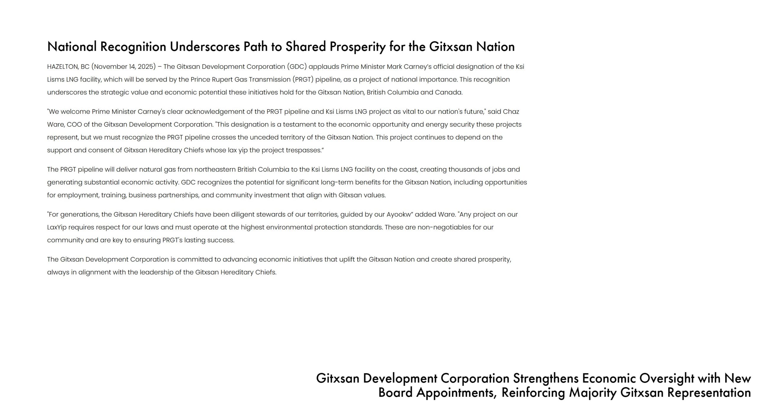 HAZELTON, BC (November 14, 2025) – The Gitxsan Development Corporation (GDC) applauds Prime Minister Mark Carney’s official designation of the Ksi Lisms LNG facility, which will be served by the Prince Rupert Gas Transmission (PRGT) pipeline, as a project of national importance. This recognition underscores the strategic value and economic potential these initiatives hold for the Gitxsan Nation, British Columbia and Canada.